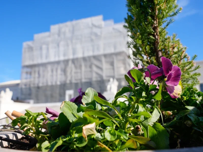With flowers in the foreground, construction on the front of the U.S. Supreme Court continues Monday, Nov. 24, 2025, in Washington. (AP Photo/Mariam Zuhaib)