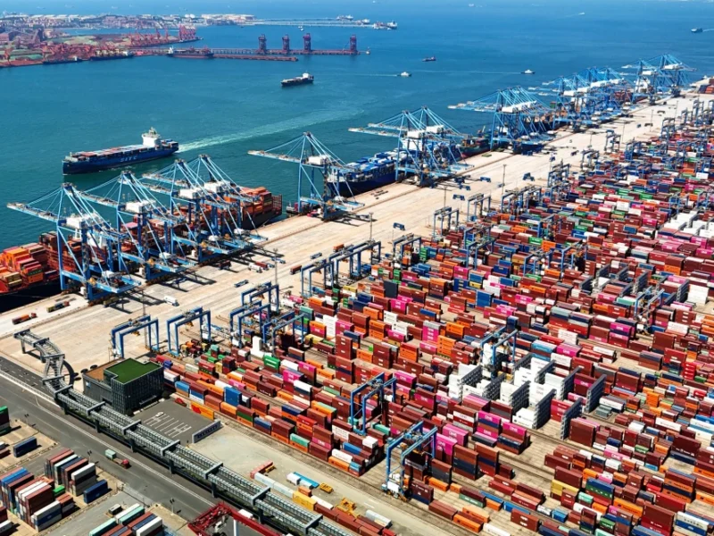 An aerial view of a container port is seen in Qingdao in east China’s Shandong province, on June 6, 2024. (Chinatopix via AP, File)