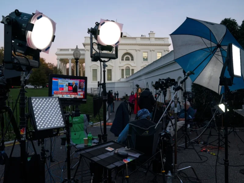 A feed from the MSNBC cable news channel is pictured on a monitor as media organizations set up outside the White House, Nov. 6, 2020, in Washington. (AP Photo/Evan Vucci, File)