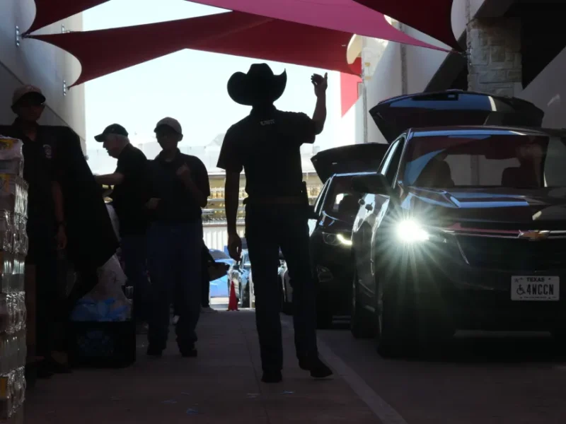 Aidan Tavor, center, directs traffic as volunteers help load vehicles during a food distribution at the San Antonio Food Bank for SNAP recipients and other households affected by the federal shutdown, Thursday, Nov. 6, 2025, in San Antonio. (AP Photo/Eric Gay)