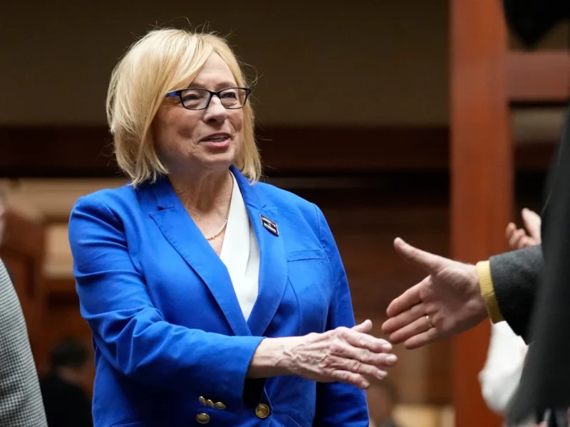 Democratic Gov. Janet Mills, greets lawmakers prior to delivering her State of the State address, Jan. 30, 2024, at the State House in Augusta, Maine. (AP Photo/Robert F. Bukaty, Flle)