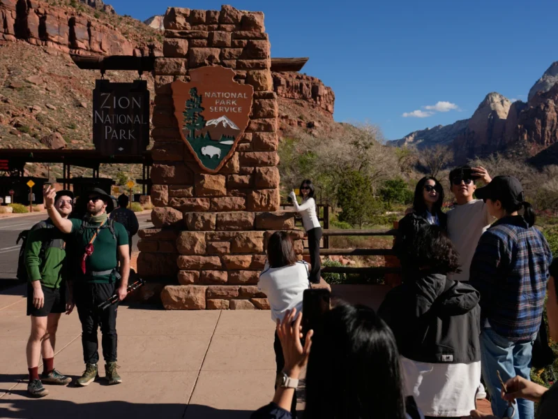 People stand near an entrance to Zion National Park, Wednesday, Oct. 1, 2025, in Springdale, Utah. (AP Photo/John Locher)