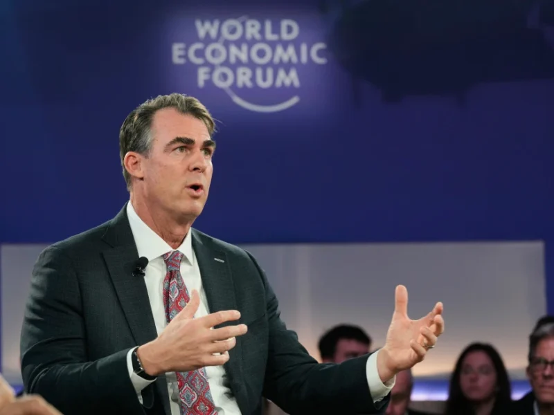 Oklahoma Gov. Kevin Stitt speaks during the Annual Meeting of the World Economic Forum in Davos, Switzerland, Wednesday, Jan. 21, 2026. (AP Photo/Markus Schreiber)