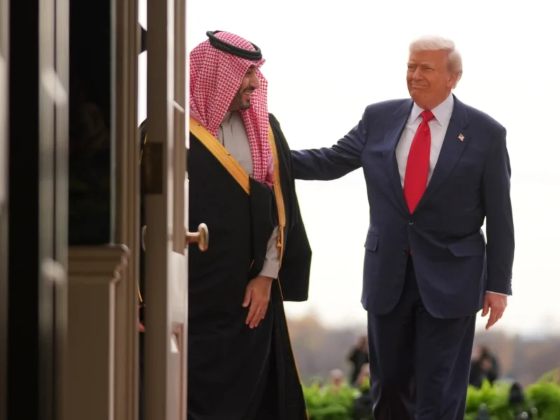 President Donald Trump welcomes Saudi Arabia’s Crown Prince Mohammed bin Salman to the White House, Tuesday, Nov. 18, 2025, in Washington. (AP Photo/Evan Vucci)