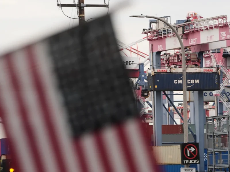 U.S. flag files at the Port of Long Beach Friday, Feb. 20, 2026, in Long Beach, Calif. (AP Photo/Damian Dovarganes)