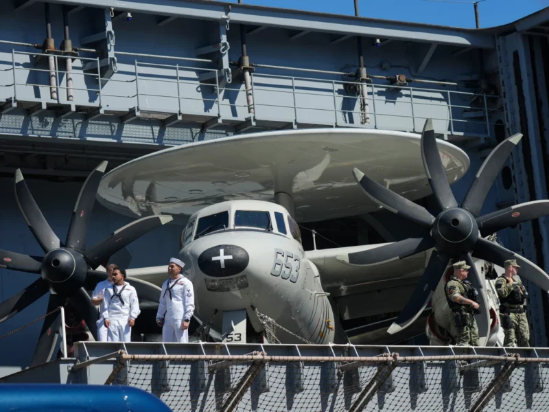 Sailors stand near a E-2 Hawkeye before President Donald Trump arrives to speak during a celebration for the 250th anniversary of the U.S. Navy aboard the USS Harry S. Truman at Naval Station Norfolk, Sunday Oct. 5, 2025 in Norfolk, Va. (AP Photo/Steve Helber)