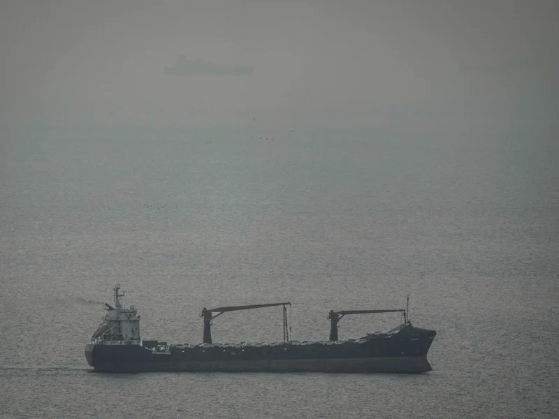 A cargo ship carrying vehicles sails through the Arabian Gulf toward the Strait of Hormuz in the United Arab Emirates, Sunday, March 22, 2026. (AP Photo)