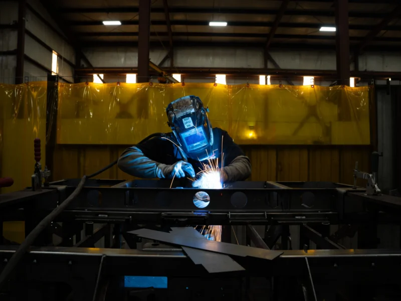 A welder is seen inside the Allen Engineering Corporation plant Monday, March 16, 2026, in Paragould, Ark. (AP Photo/Kevin Wurm)