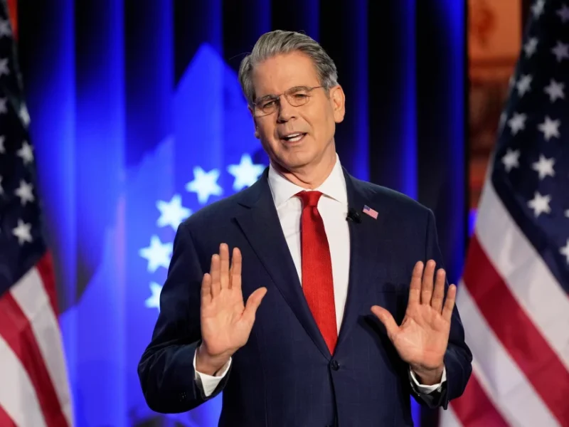 Scott Bessent, US Secretary of the Treasury, holds a speech at the USA House during the Annual Meeting of the World Economic Forum in Davos, Switzerland, Tuesday, Jan. 20, 2026. (AP Photo/Markus Schreiber)