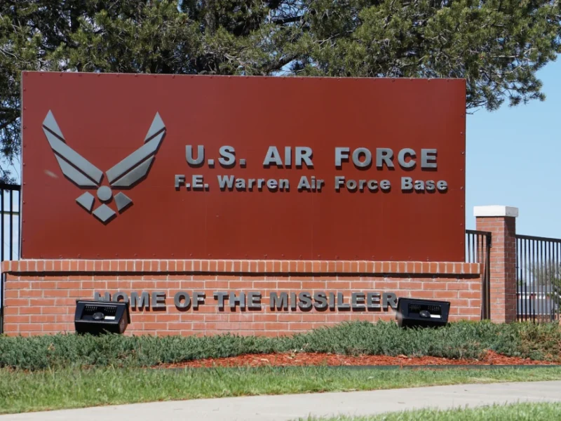 The entrance to F.E. Warren Air Force Base in Cheyenne, Wyo., May 24, 2108. (AP Photo/Mead Gruver, File)