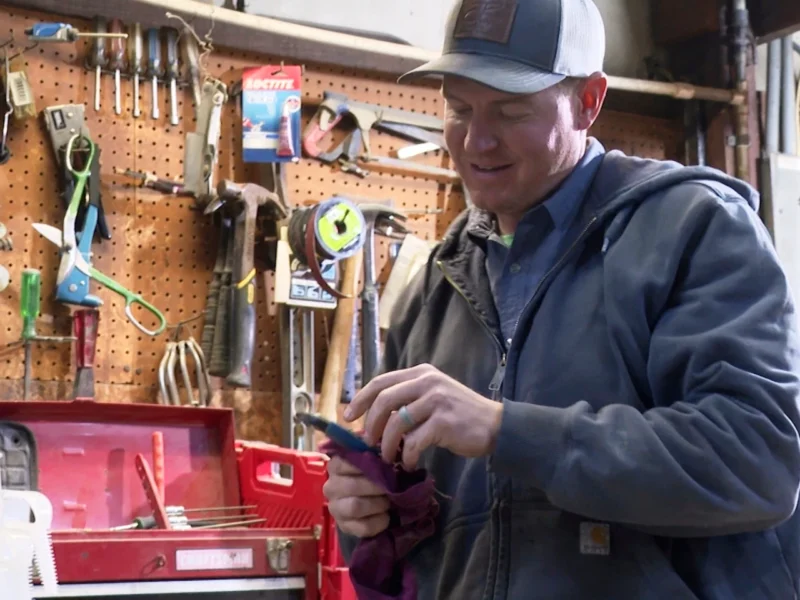 Bryant Kagay holds a tool in the workshop of the farm he co-owns with his father and grandfather in Amity, Missouri, April 4, 2025. (AP Photo/Nick Ingram, File)