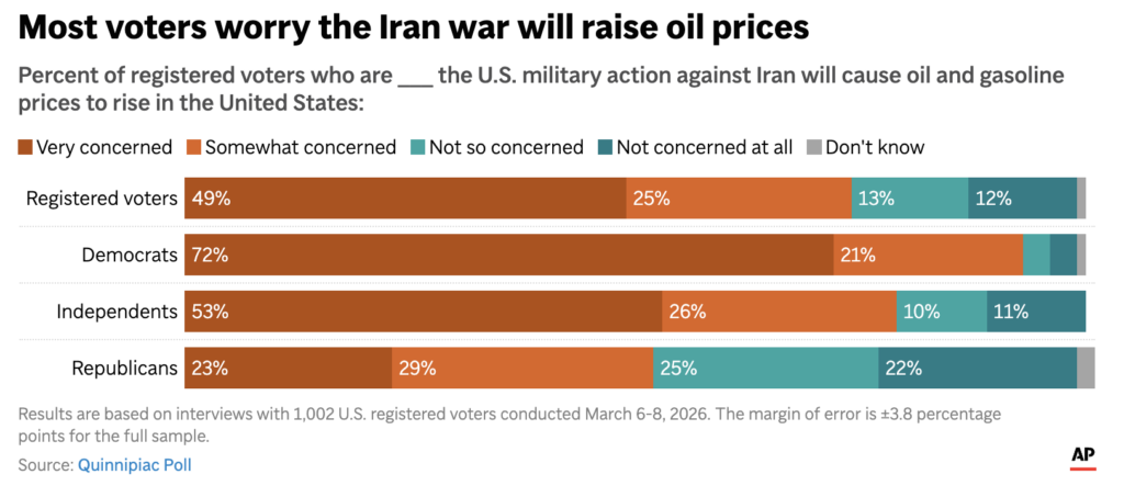 Fluctuating oil prices may already be alarming voters. Polls conducted over the weekend found a large majority of Americans are worried about the war causing oil and gasoline prices to rise. The vast majority expect the U.S. action against Iran will last at least “months,” if not longer.
