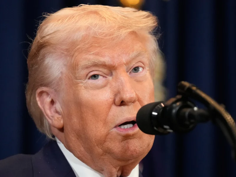 President Donald Trump speaks at a news conference, Monday, March 9, 2026, at Trump National Doral Miami in Doral, Fla. (AP Photo/Mark Schiefelbein)