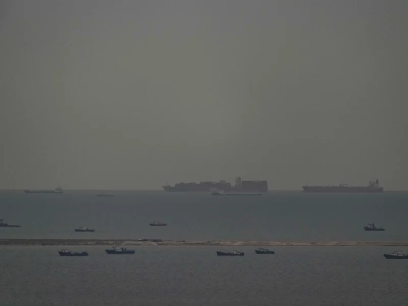 Fishing boats dot the sea as cargo ships, in the background, sail through the Arabian Gulf toward the Strait of Hormuz off the United Arab Emirates, Friday, March 27, 2026. (AP Photo)