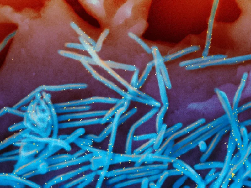 This electron microscope image provided by the National Institutes of Health shows human respiratory syncytial virus (RSV) virions, colorized blue, and anti-RSV F protein/gold antibodies, colorized yellow, shedding from the surface of human lung cells. (National Institute of Allergy and Infectious Diseases, NIH via AP, File)