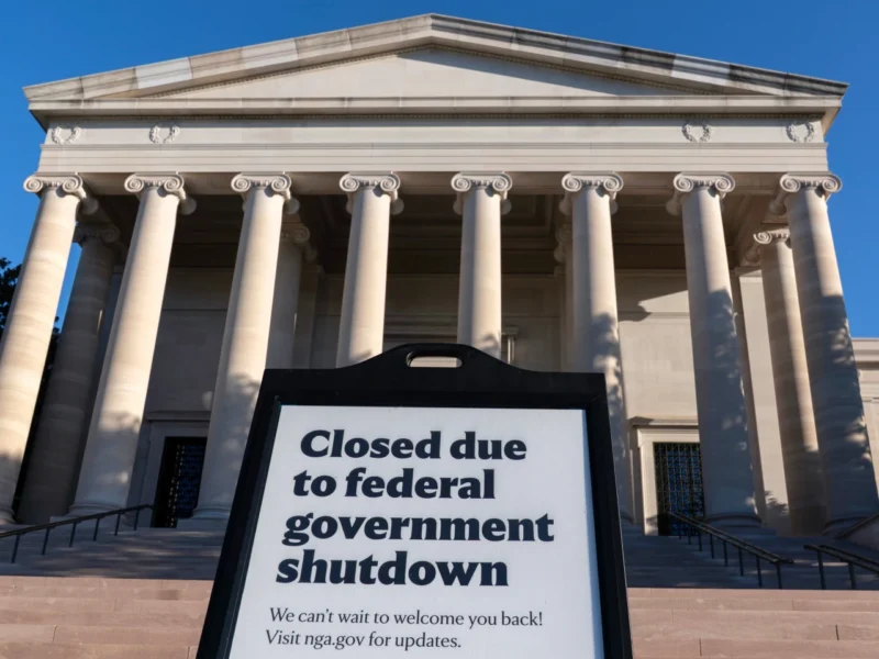 A sign that reads “Closed due to federal government shutdown,” is seen outside of the National Gallery of Art in Washington, Oct. 6, 2025. (AP Photo/Jose Luis Magana, File)